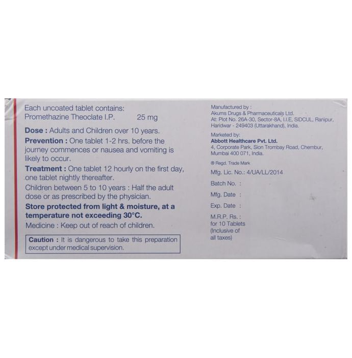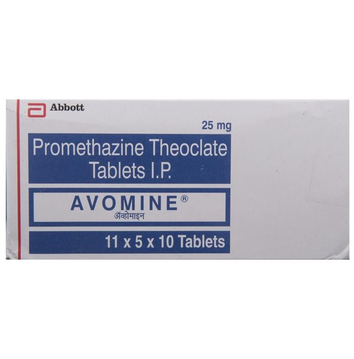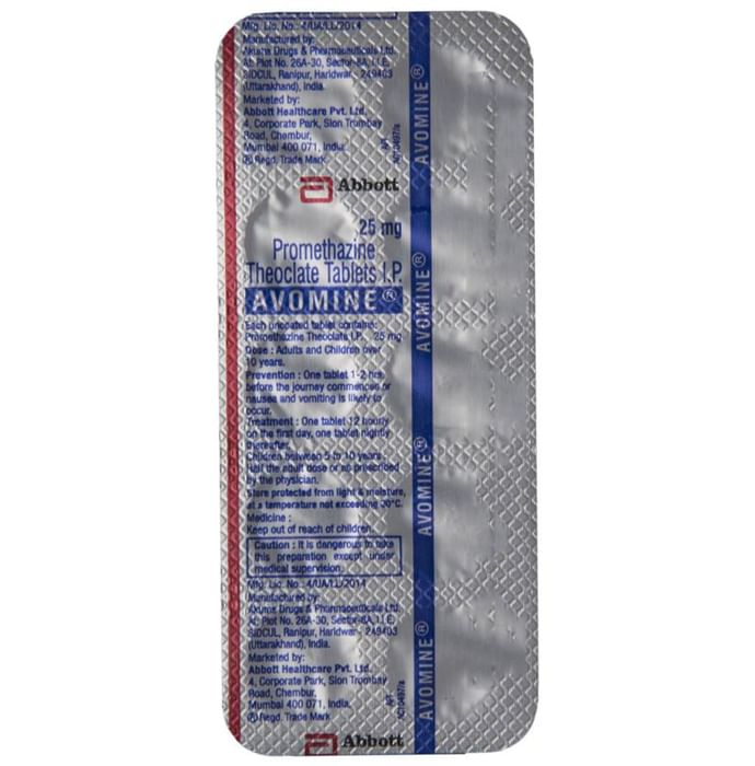 Avomine Tablet used in the treatment of nausea and vomiting related to certain conditions like before/after surgery or motion sickness. It may also be used to treat allergic conditions such as rash, itching, and runny nose. Avomine Tablet should be taken with or without food, but take it at the same time every day to get the most benefit. The dose and how often you take it depend on what you are taking it for. Your doctor will decide how much you need to improve your symptoms. You should take this medicine for as long as it is prescribed for you. If you miss a dose, take it as soon as you remember it. However, you should never take a double dose. Inform your doctor if your symptoms do not improve within 7 days of treatment. The most common side effects of this medicine include dry mouth, blur vision, headache, and feeling dizzy. If these bother you or appear serious, let your doctor know. There may be ways of reducing or preventing them. It makes skin more sensitive to sunlight. Use a sunscreen or wear protective clothing before going out. Before taking this medicine, let your doctor know if you have glaucoma or have asthma issues, or have high blood pressure. Inform your doctor if you are pregnant, or breastfeeding. Your doctor should also know about all other medicines you are taking as many of these may make this medicine less effective or change the way it works. Generally, it is advised to avoid alcohol while on treatment.
