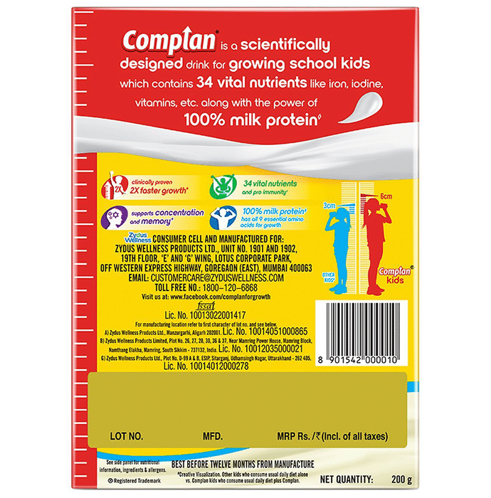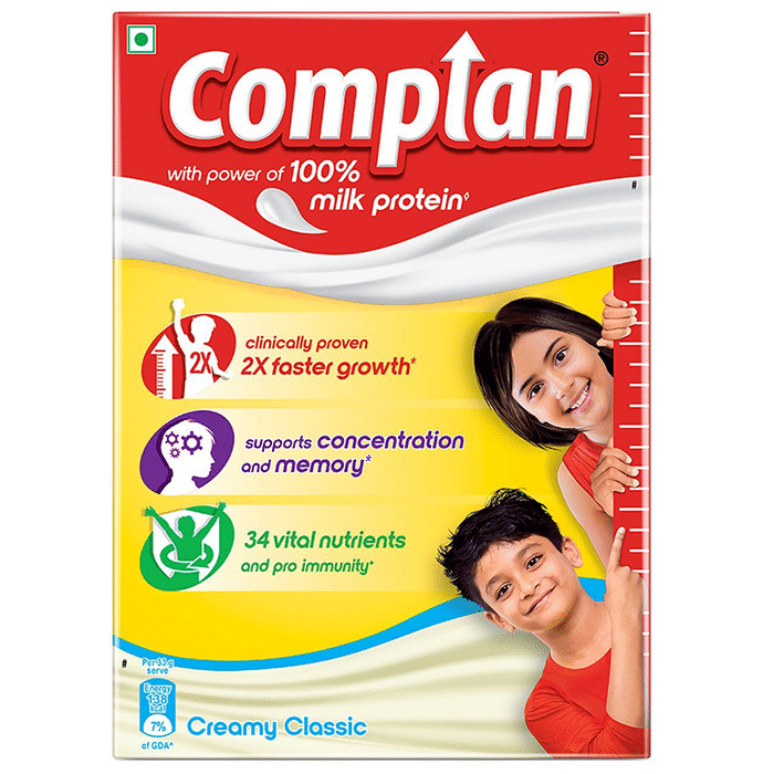Complan Nutrigro is the complete planned nutrition for a child’s overall growth. It contains 34 vital nutrients including carbohydrate, protein, fat, vitamins, and minerals. | Key Ingredients: Milk solids (34.2%) (Skimmed Milk Powder Whey Protein Concentrate (9.3%) Casein (2%) Sugar Maltodextrin Peanut Oil Minerals Fructo-oligosaccharide Annatto (INS 160b(ii)) Vitamins Thickener (INS 415) DHA Taurine Inositol L-Carnitine Nucleotides Bifidobacterium lactis | Key Benefits: The perfect balance of high-quality milk protein: 50:50 Whey: Casein which helps to support muscle growth and easy digestion Contains micronutrients – Zinc, Selenium, Copper, Vitamin A, C, E, B6 and B12, beta Carotene and molybdenum which helps to reduces the risk of infection 90% RDA calcium and vitamin D helps to support strong and healthy bones The right balance of brain nutrients helps to improve IQ, neurodevelopment, learning, problem-solving and cognitive abilities | Directions for Use: Take powder in a glass/cup as per suggested serving Add a little warm milk/water Stir till smooth and creamy Fill up with remaining milk/water | Safety Information: Read the label carefully before use Store in a cool dry place away from direct sunlight Keep out of reach of the children