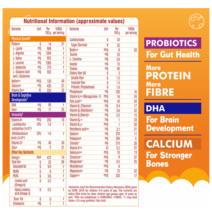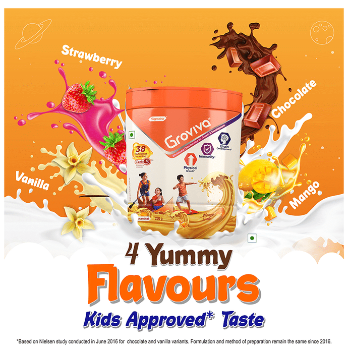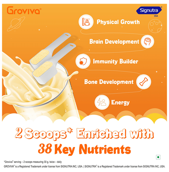 Groviva Powder is a customised, wholesome child nutrition brand made as per ICMR guidelines. GrovivaTM is scientifically formulated with 38 key nutrients, wherein Certi 5TM signature nutrients support daily nutrition in children. | Key Ingredients: Oils (palm oil and soybean oil), sucrose, milk solids (19.2%), maltodextrin, soy protein isolate (7.45%), nature – identical flavouring substances (chocolate), cocoa solids, fibres [soy fibre (0.898%) and polydextrose (1.6%)], acidity regulators [INS 331(iii)], minerals, emulsifier [ins 322(I)], dha powder (0.47%), vitamins, probiotics [lactobacillus acidophilus ncfm (0.022%) and bifidobacterium lactis hn019 (0.073%)], choline chloride, antioxidant premix [antioxidants (INS 304), rapeseed oil and sunflower oil], L-carnitine, inositol and taurine. | Key Benefits: High-quality protein (PDCAAS 1) – It contains soy protein isolate (SUPRO) and milk protein with amino acids, which are building blocks of protein for growth in children DHA – Adequate consumption of DHA may help support normal brain development Dietary fibre – Appropriate consumption of soluble and insoluble fibre every day may support bowel movement Probiotics – Adequate consumption of lactobacillus acidophilus NCFM and bifidobacterium lactis HN019 every day can support the immune function by preventing harmful bacterial growth in the gut3 Calcium – It can contribute to normal growth and bone development | Directions For Use: Take 2 scoops (30 gm) in 100 ml lukewarm water/milk twice a day | Safety Information: Read the label carefully before use Store in a cool and dry place, away from sunlight Keep out of reach of children Don?t exceed the recommended dosage